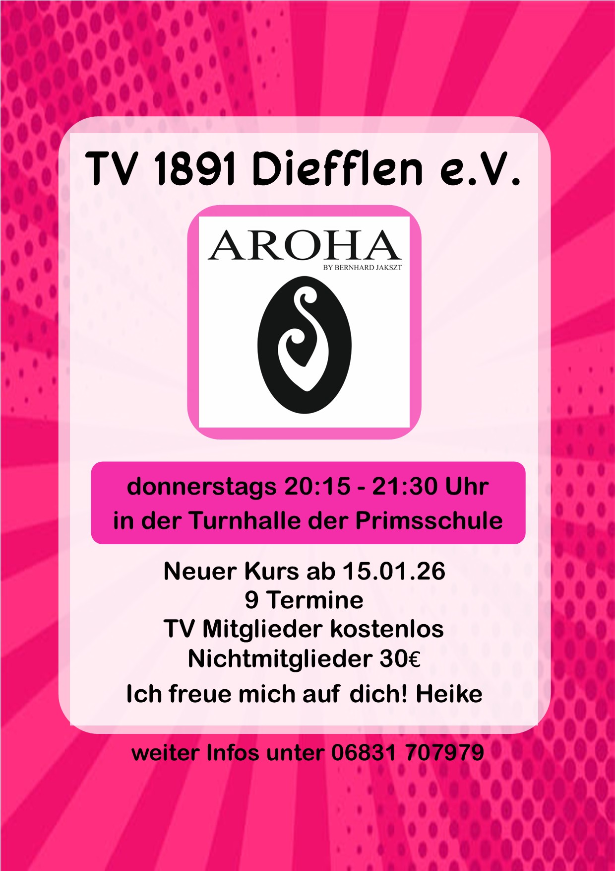 Unsere AROHA- Instructorin/DTBAkademie Heike Weber wird euch durch abwechslungsreiche Einheiten begleiten.
