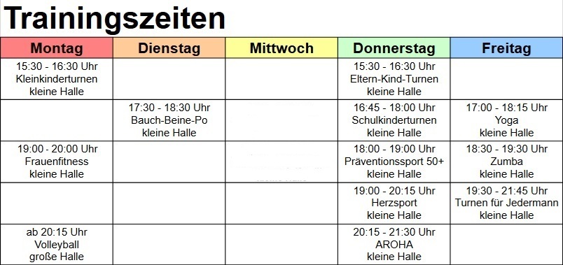 Zur besseren Übersicht hier noch einmal die Trainingszeiten der Abteilungen